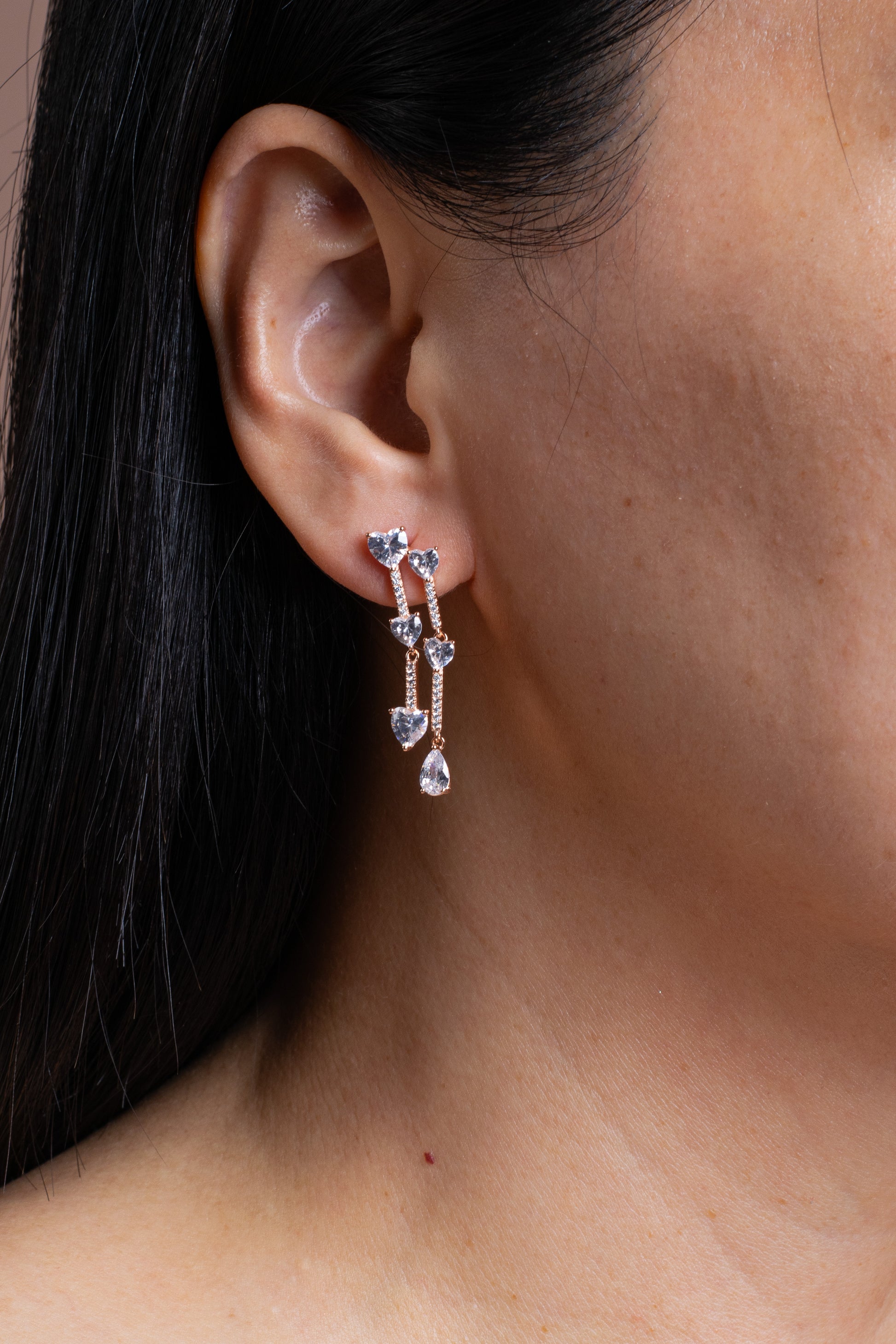 - Design: A modern drop silhouette featuring heart-shaped stones suspended between twin crystal bars, elegant, romantic, and effortlessly striking.