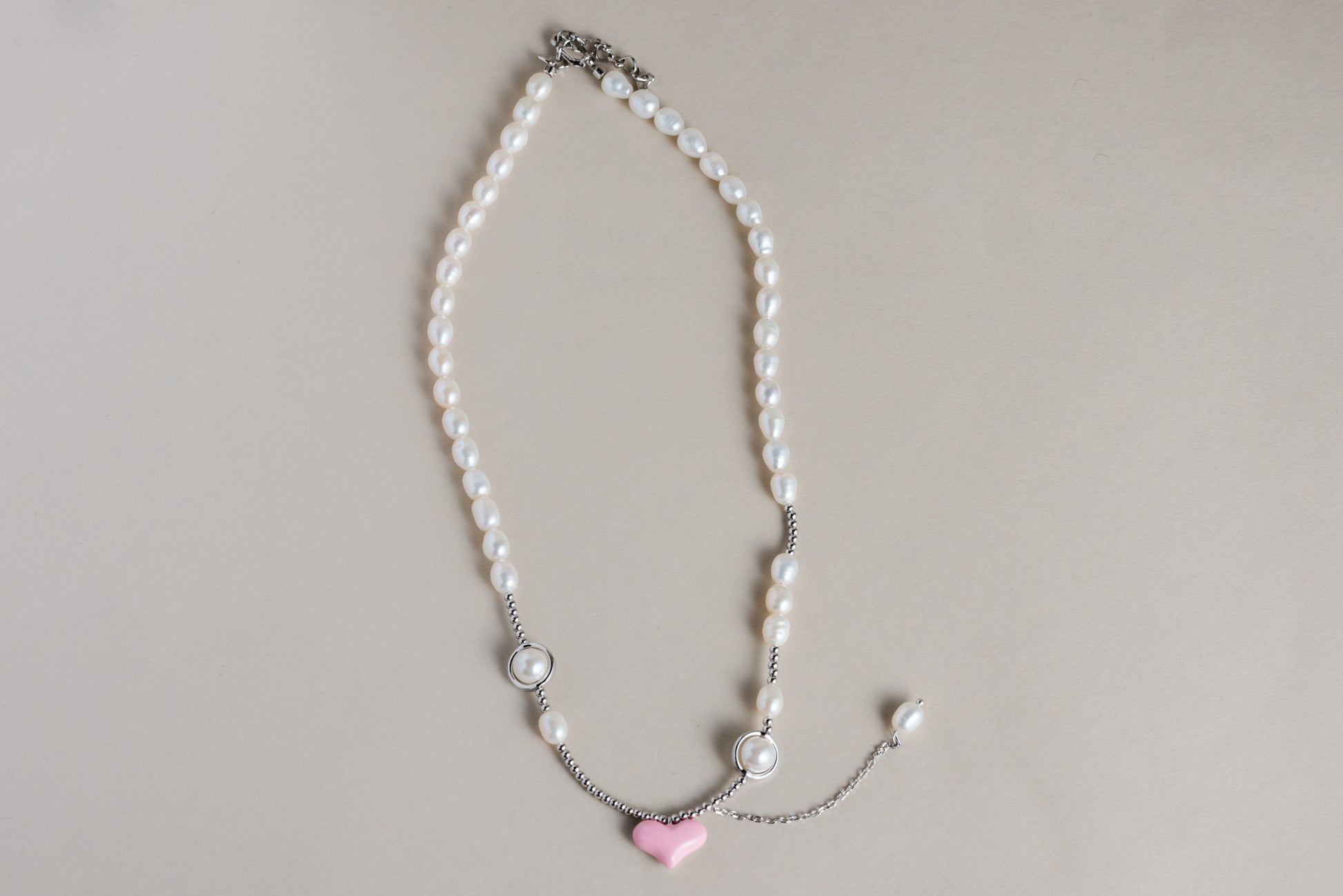 The Alissa Necklace brings out your inner light with a touch of tenderness. A sweet pink heart rests softly amid dancing freshwater pearls and silver accents, like a gentle reminder that vulnerability is strength. With its thoughtful asymmetry and playful chain detail, Alissa embodies the delicate power of loving yourself—flaws, depth, and all.