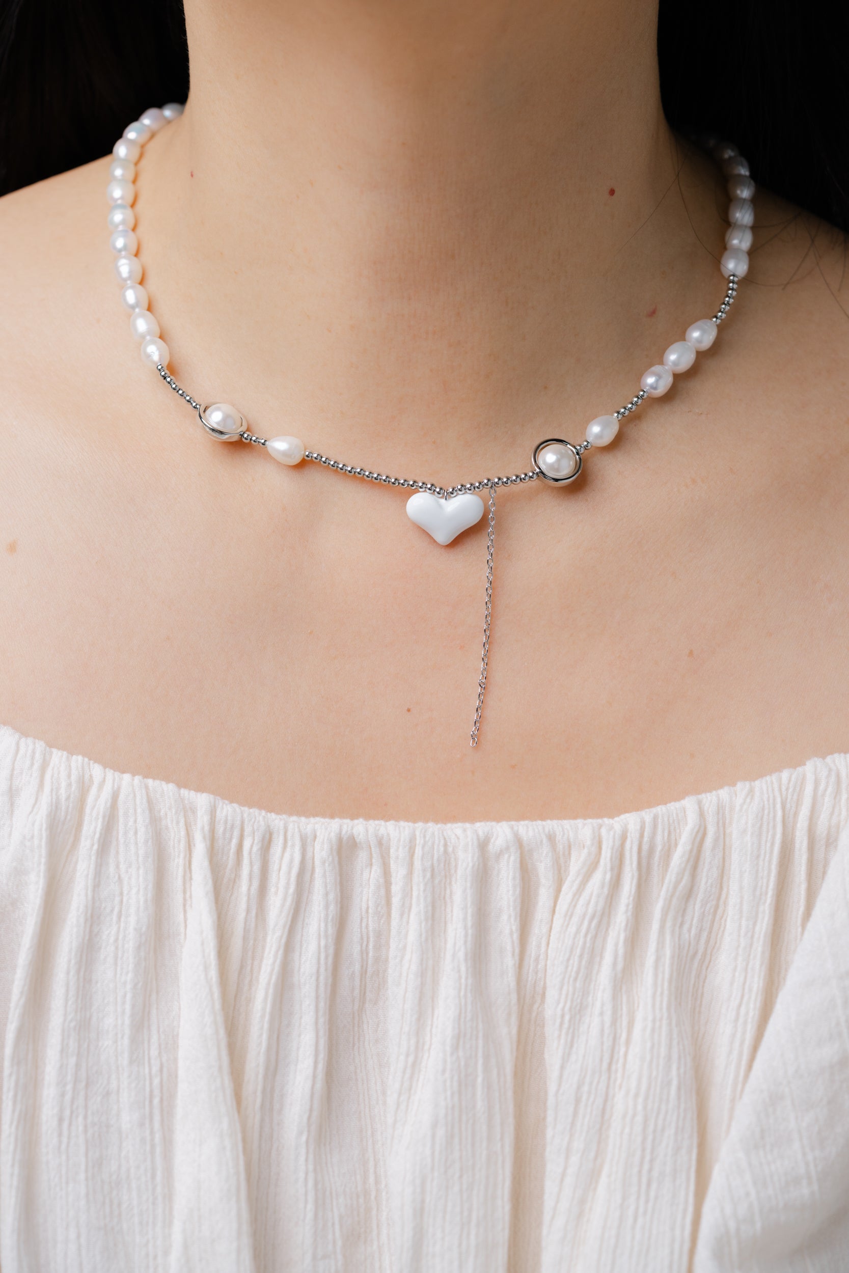 The Alissa Necklace brings out your inner light with a touch of tenderness. A sweet white heart rests softly amid dancing freshwater pearls and silver accents, like a gentle reminder that vulnerability is strength. With its thoughtful asymmetry and playful chain detail, Alissa embodies the delicate power of loving yourself—flaws, depth, and all.