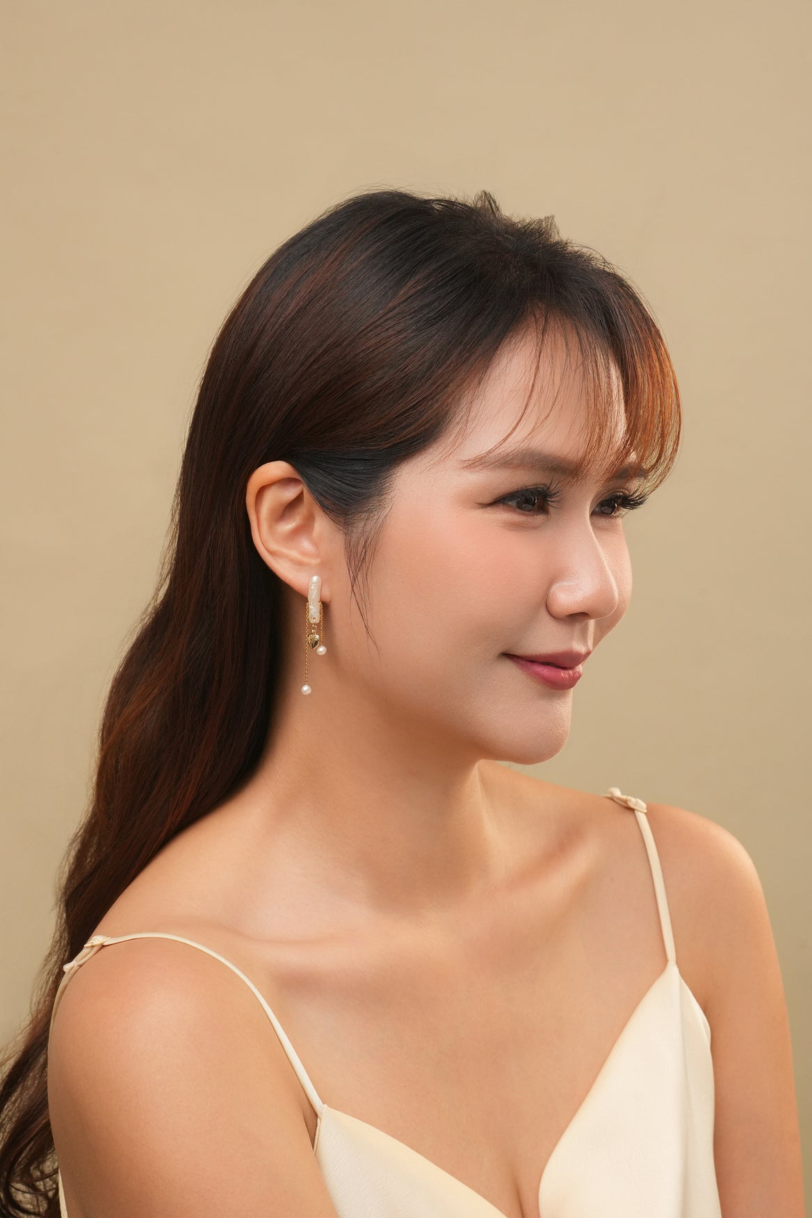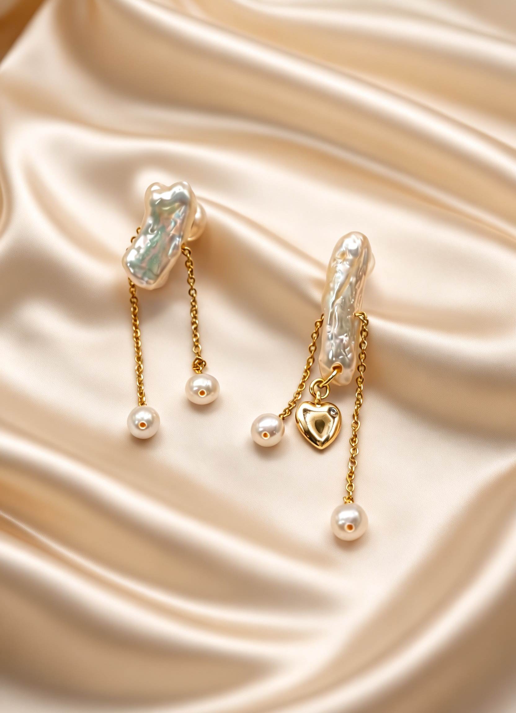 - Design: An asymmetrical drop earring featuring organic freshwater pearls, fine gold chains, and a subtle heart accent. Delicate yet meaningful, celebrating individuality, emotional depth, and quiet confidence.
