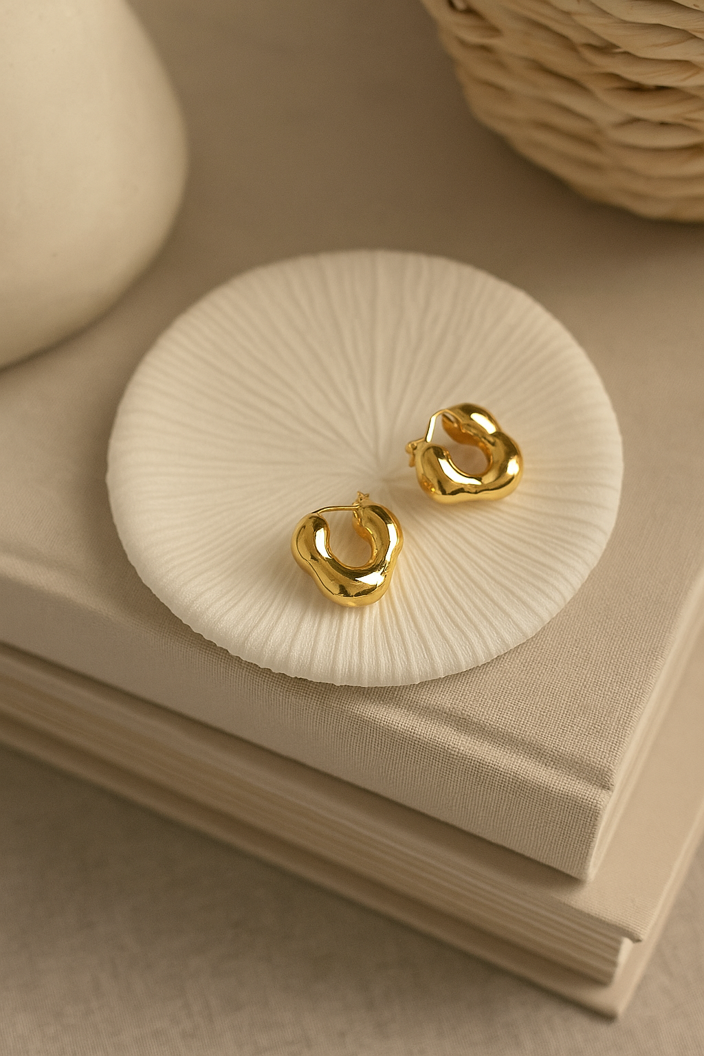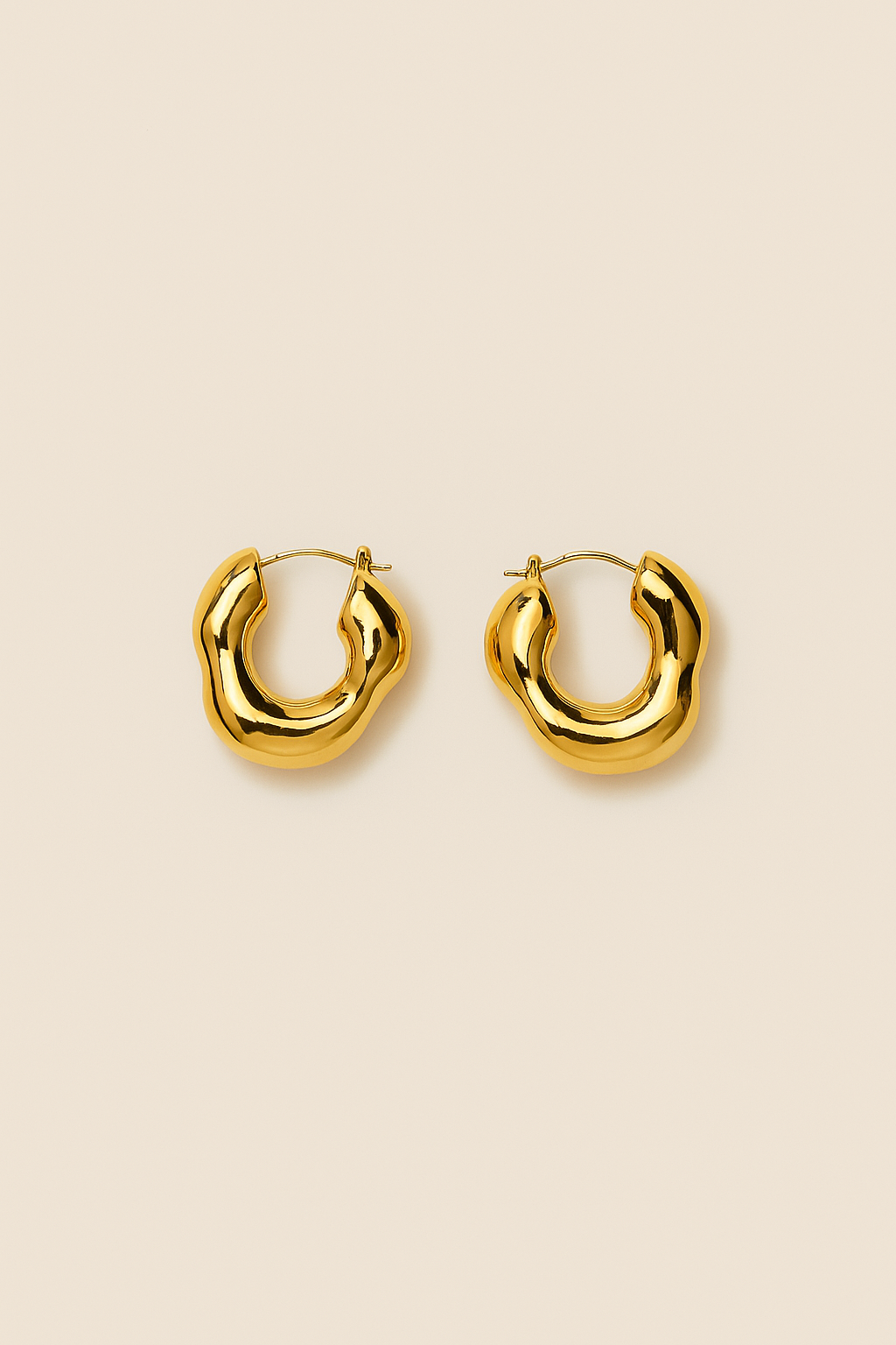 Sleek, sculptural, and bold in the best way. The Waveform Hoops feature a fluid, molten silhouette that catches the light at every angle.