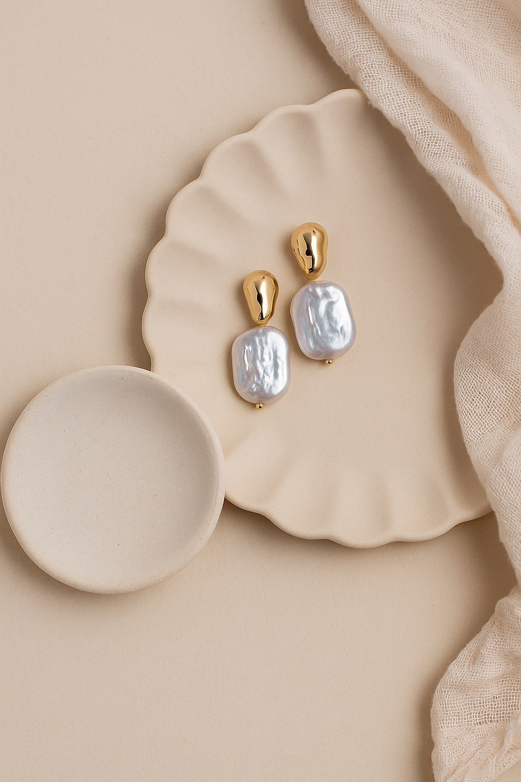 Design: Organic molten gold studs paired with freeform baroque pearls — no two are ever the same, just like your story