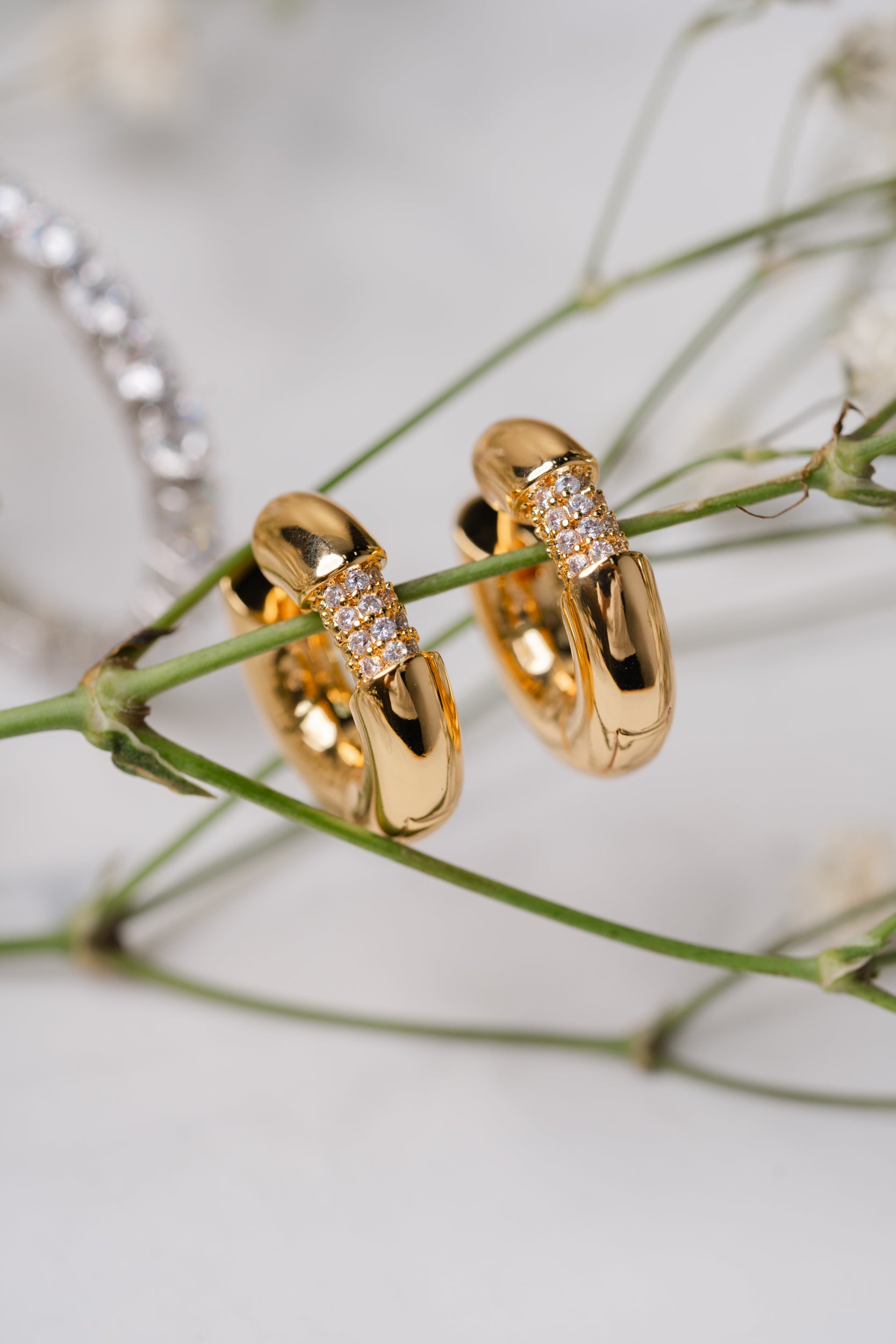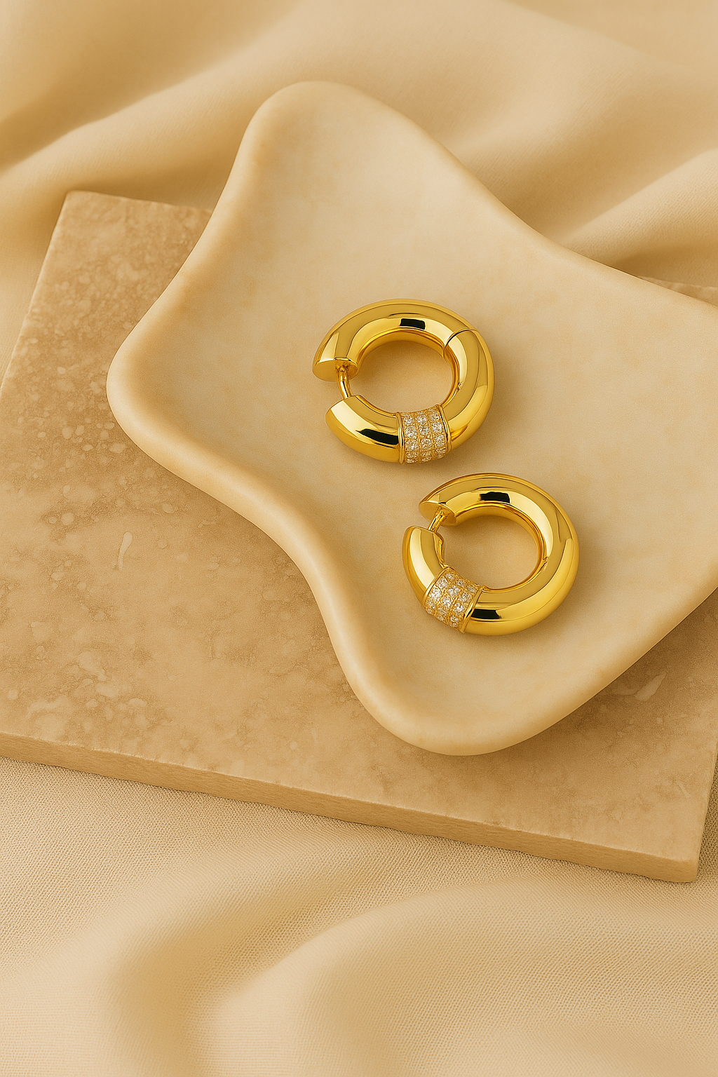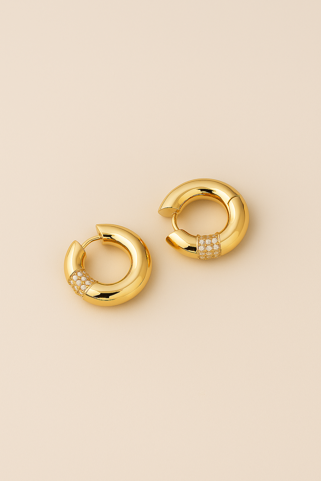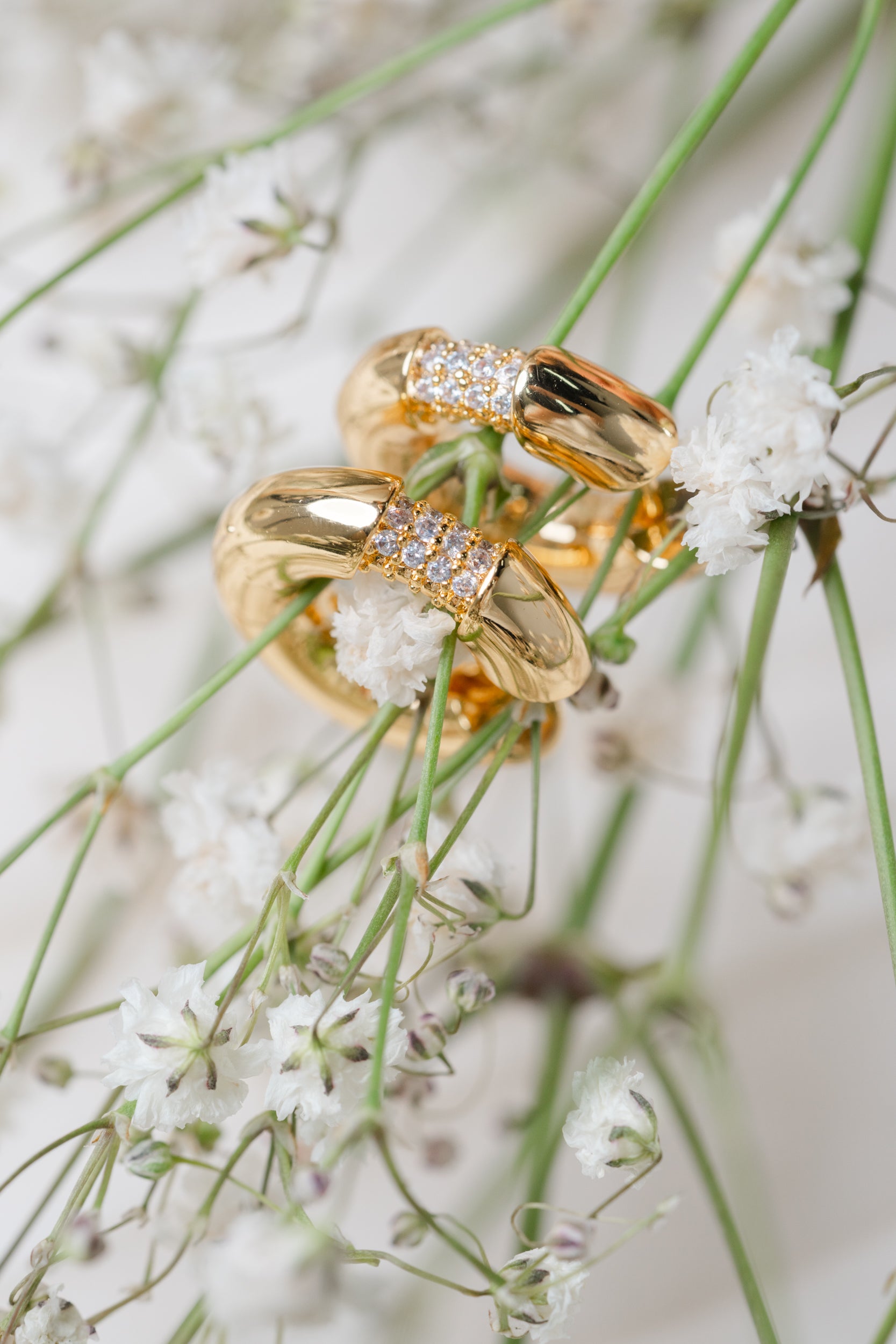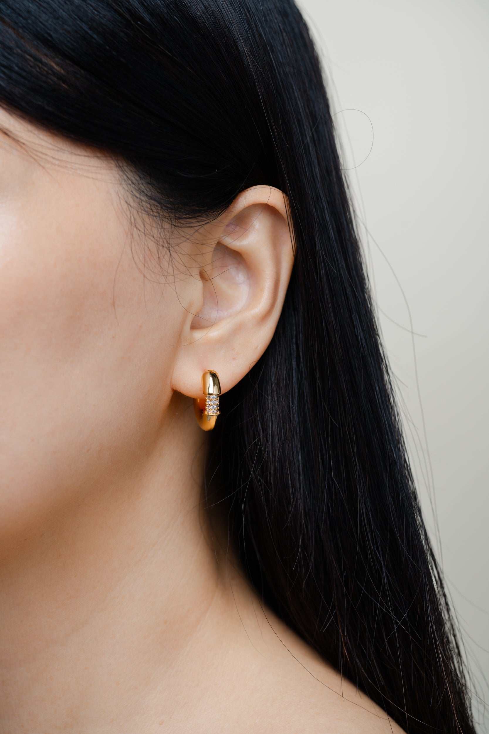 Sleek, sculptural, and softly radiant — the Justi Huggies are your new go-to glow-up essentials. Their bold rounded shape is balanced with a touch of pavé sparkle, making them effortlessly elegant for daily wear or evening flair. Designed for the woman who shines without trying, these huggies are quiet confidence in earring form.