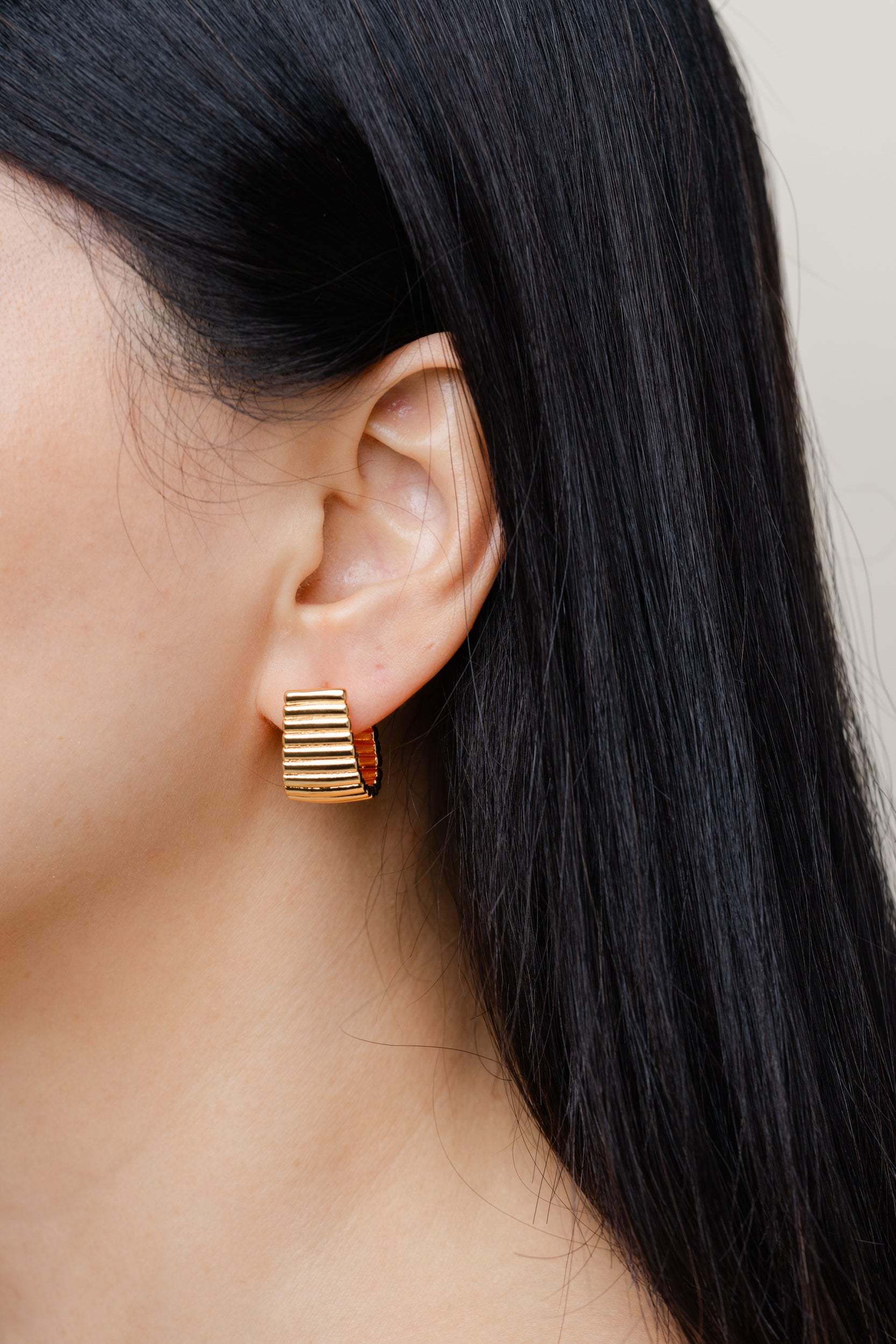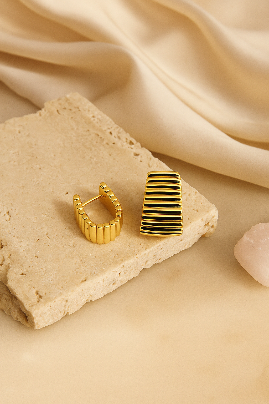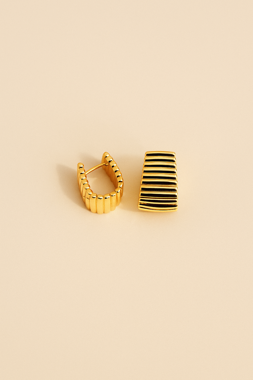 - Design: Structured huggies with raised ribbed lines, combining clean geometry and golden shine.