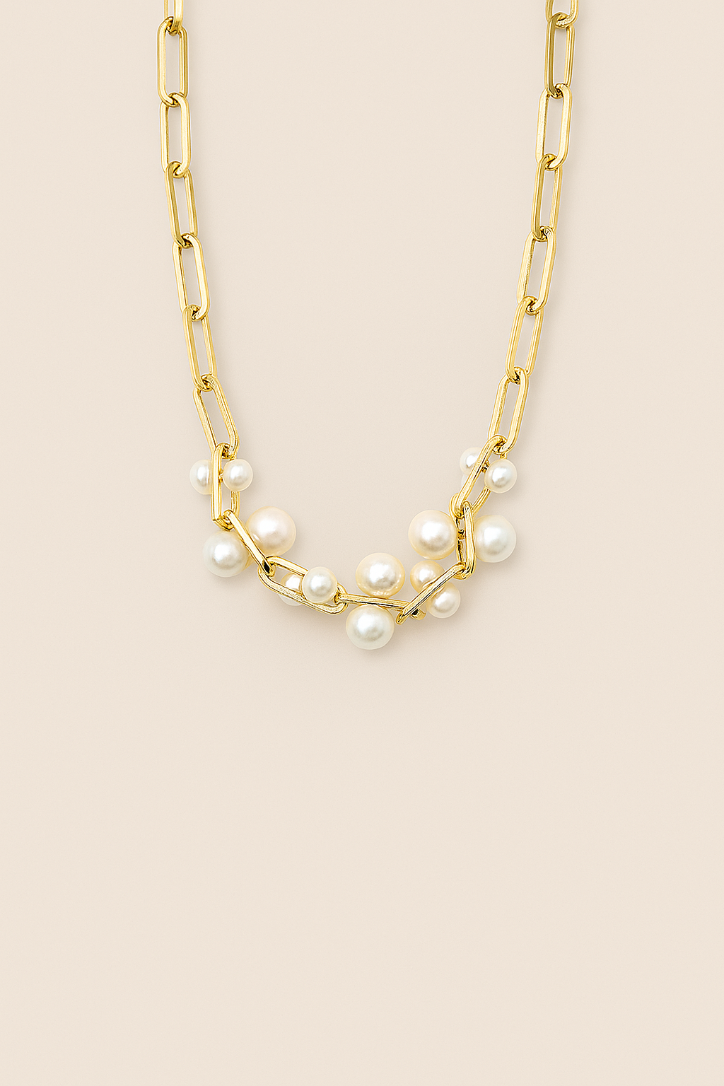 - Design: A statement necklace combining bold, elongated chain links with clustered freshwater pearls, a modern interplay of strength and softness.