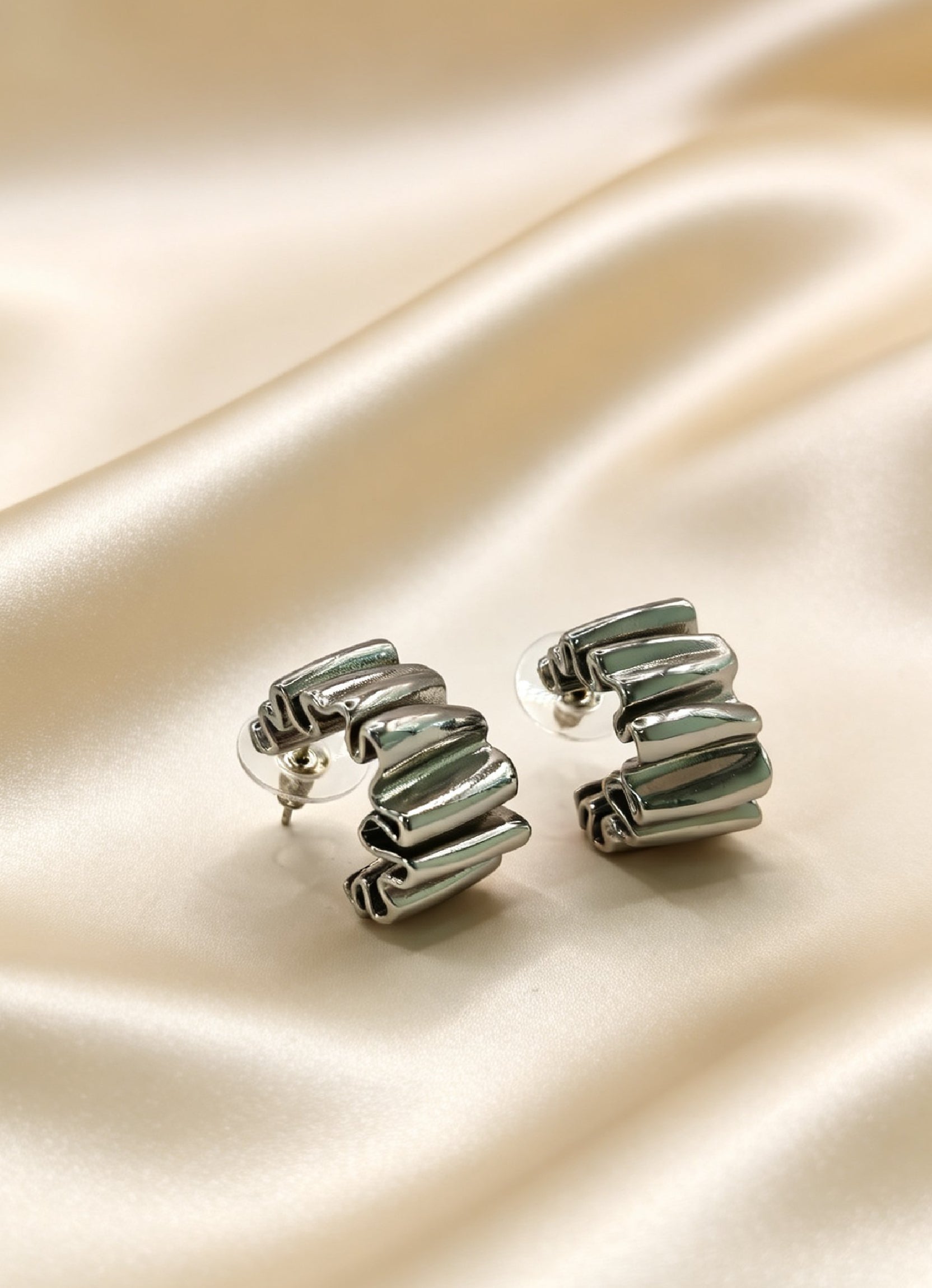 The Quinn Earrings are a celebration of high-fashion texture and industrial chic. These "C" shaped hoops feature a unique pleated design, resembling folded ribbons of liquid silver that create a dynamic interplay of light and shadow. Their bold, ridged silhouette provides a sophisticated edge, making them the perfect choice for those who want to add a touch of architectural brilliance to their jewelry collection.