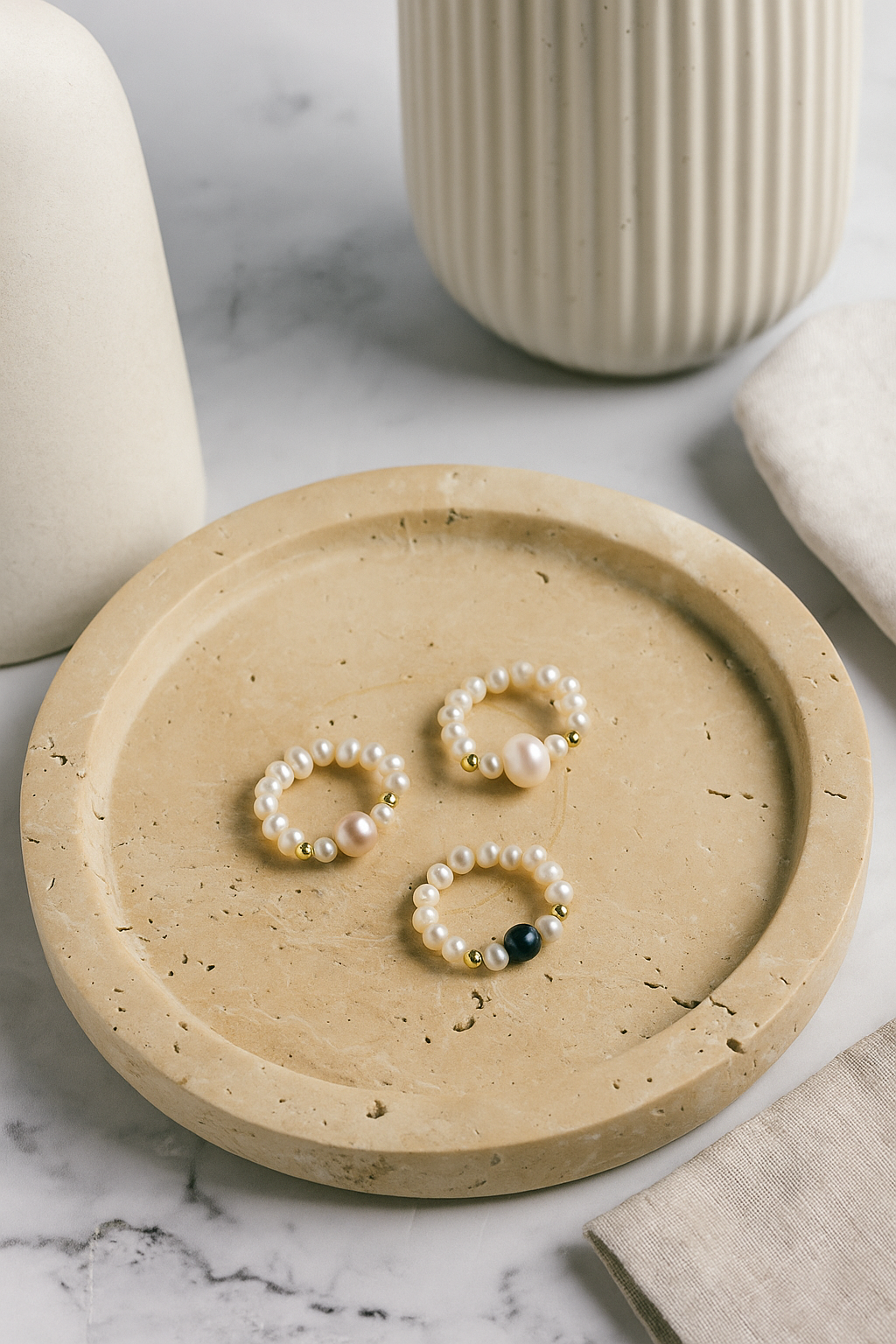 Each ring features classic white mini pearls and a single colored pearl at the center — available in classic white, soft pink, or green. Wear one for a hint of elegance or stack a few for a custom color mix.