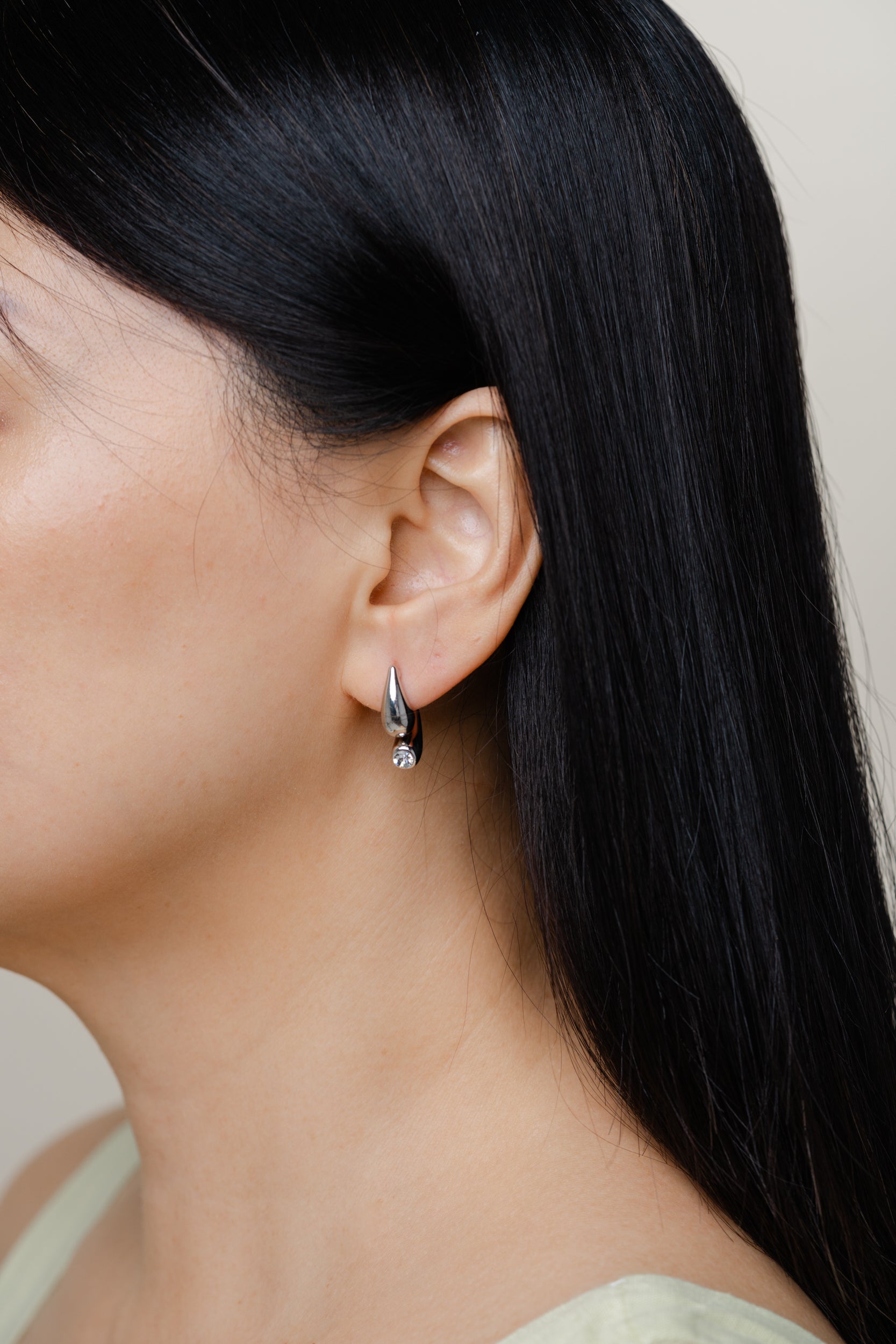 - Design: Sleek mismatched earrings with one short, crystal-accented curve and one elongated sculptural arc in polished silver.
