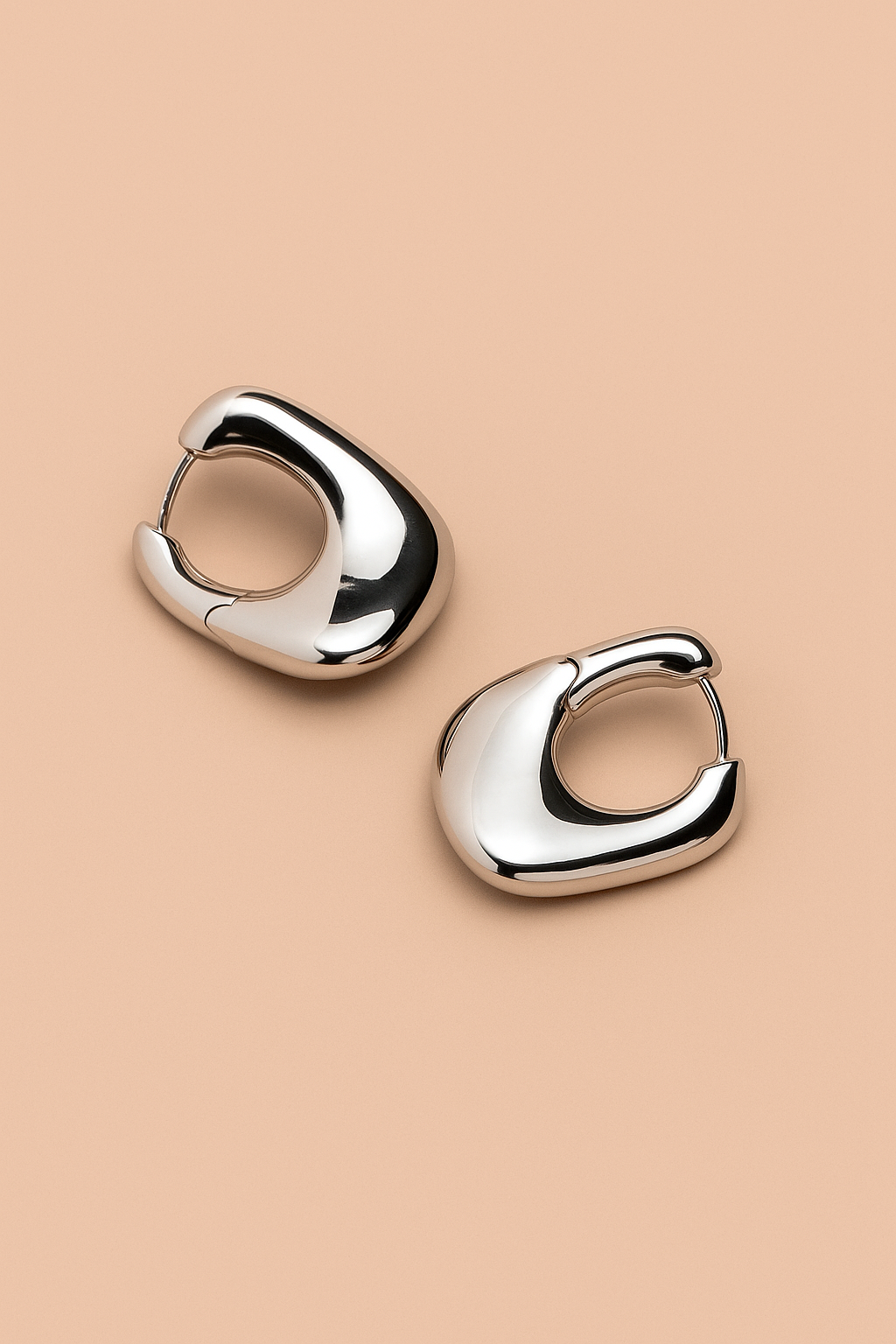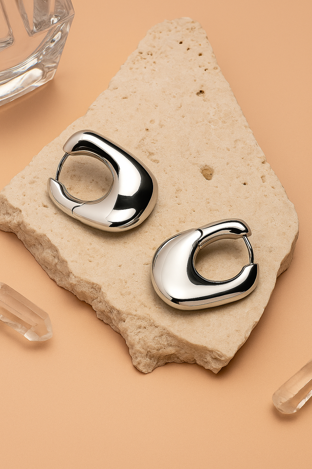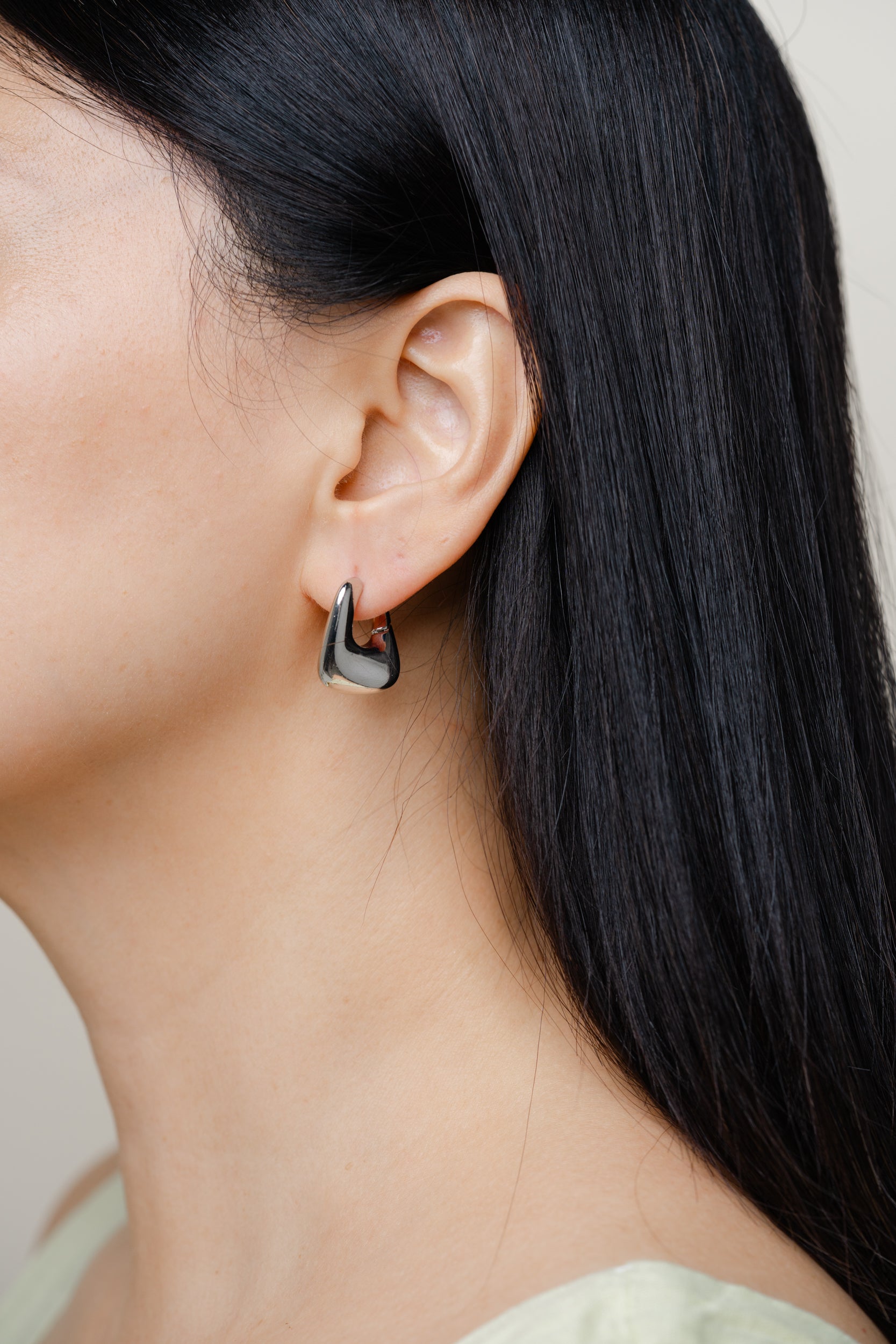 Refined yet edgy, the Yoona Huggies in Silver are designed with modern fluidity. Their geometric curves make them a versatile staple that feels bold but never overpowering.